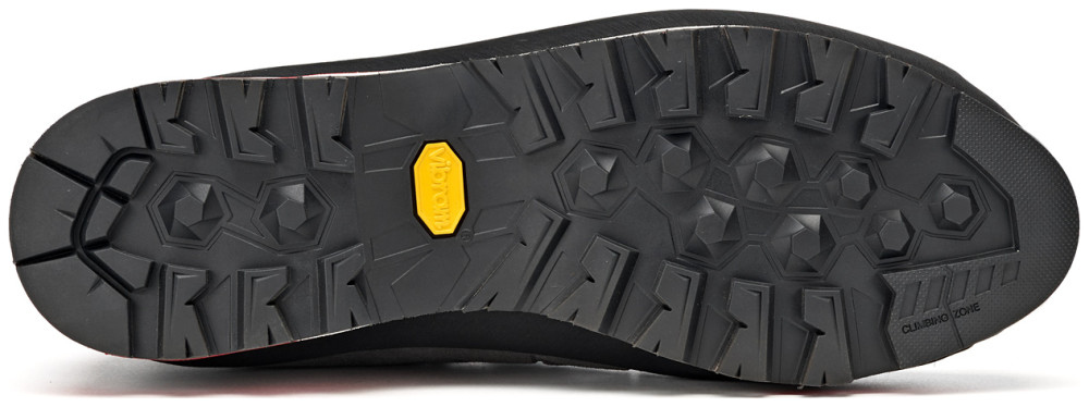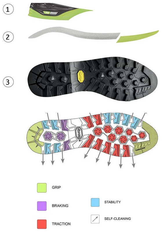 • Σύσταση Σόλας: Η μικροπορώδης ενδιάμεση σόλα δύο χρωμάτων και μονής πυκνότητας προσφέρει σταθερότητα και υποστήριξη ενώ η ενισχυμένη φτέρνα από πολυουρεθάνη που καλύπτεται με επιπλέον μεμβράνη TPU σε όλη την επιφάνεια της σόλας, προσφέρει εξαιρετική αντικραδασμική προστασία. Η εξωτερική σόλα Asolo/Vibram Master έχει σχεδιασμό αυτοκαθαρισμού για την απομάκρυνση πέτρας και λάσπης και χρησιμοποιεί την ένωση Vibram Mont που προσφέρει καλύτερο κράτημα, απόδοση και ανθεκτικότητα.